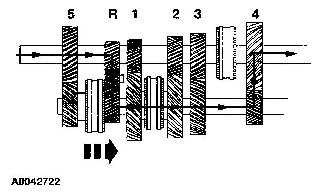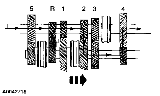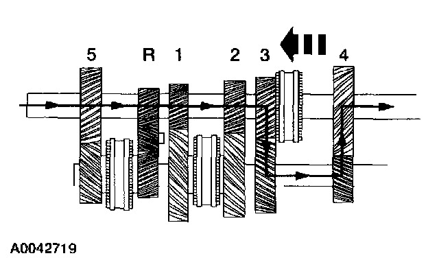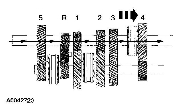 ^ When the synchronizer sleeve is shifted forward, the fifth gear is engaged to the countershaft through the synchronizer hub.