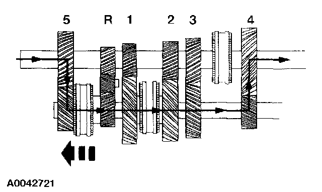 ^ The fifth/reverse synchronizer hub is splined to the countershaft.When the synchronizer sleeve is shifted rearward, the countershaft reverse gear is engaged to the countershaft through the synchronizer hub.