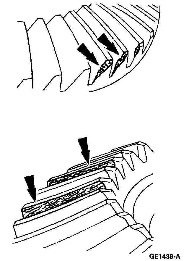 To check the ring gear and pinion, remove as much lubricant as possible from the gears with clean solvent. Wipe the gears dry or blow them dry with compressed air. Look for scored or damaged teeth. Also look for cracks or other damage.