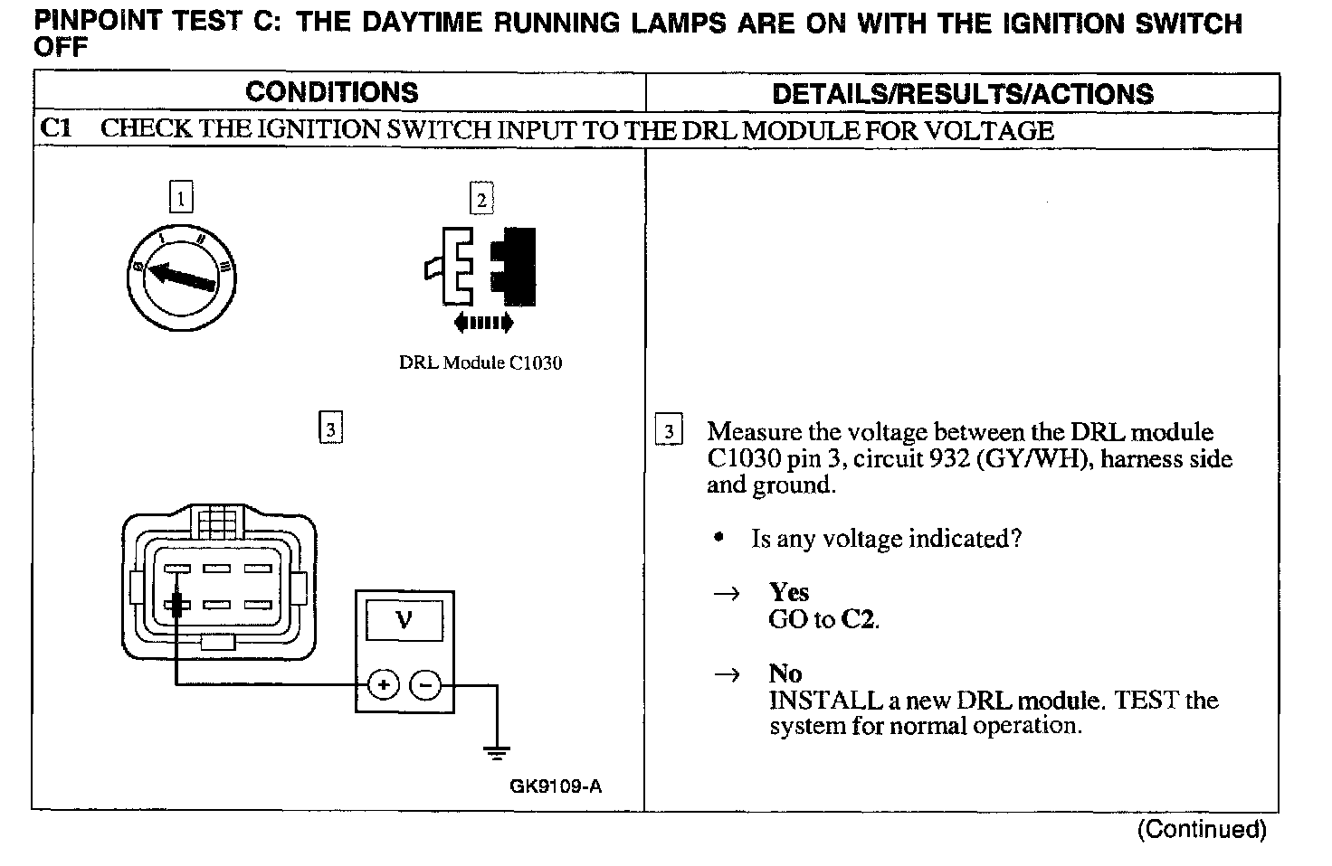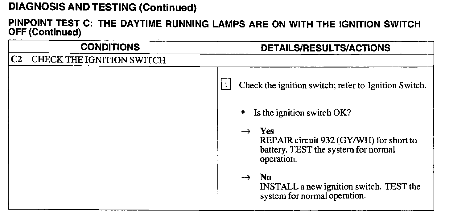 PINPOINT TEST C: DAYTIME RUNNING LAMPS ARE ON WITH THE IGNITION SWITCH OFF