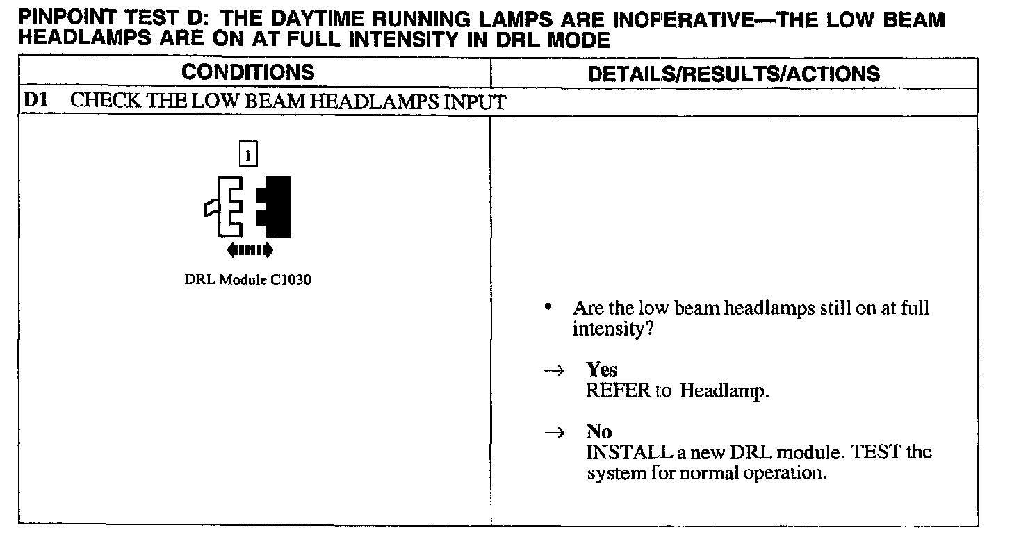 PINPOINT TEST D: DAYTIME RUNNING LAMPS ARE INOPERATIVE - THE LOW BEAM HEADLAMPS ARE ON AT FULL INTENSITY IN DRL MODE