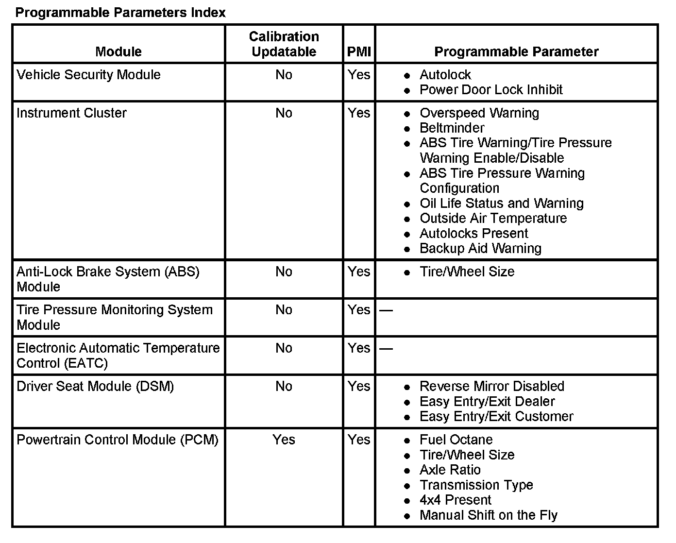Probgmrammable Parameters Index: