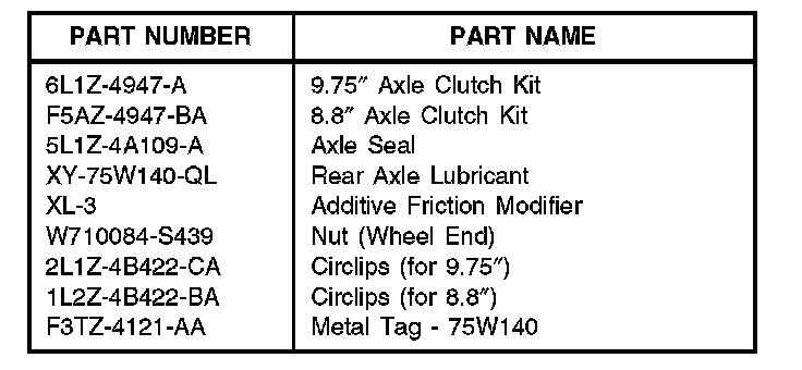 ^ For IRS axles, the half shaft seals need to be replaced. Expedition and Explorer/Mountaineer applications should use seal kit part number SL1Z-4A109-A. Removal of the half shaft excluder seal 1L2Z-1N013 may be required, if equipped, to facilitate re-assembly