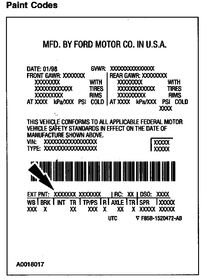 The first set of code numbers list the primary body color, the second set of code numbers list the lower body or two-tone paint code (if applicable).