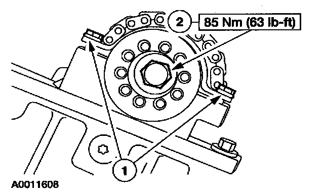 10. CAUTION: The right-hand camshaft sprocket bolt is a left-hand threaded bolt.