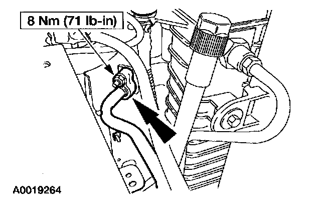 2. Disconnect the A/C manifold and tube from the A/C condenser core. Remove and discard the O-ring seal.