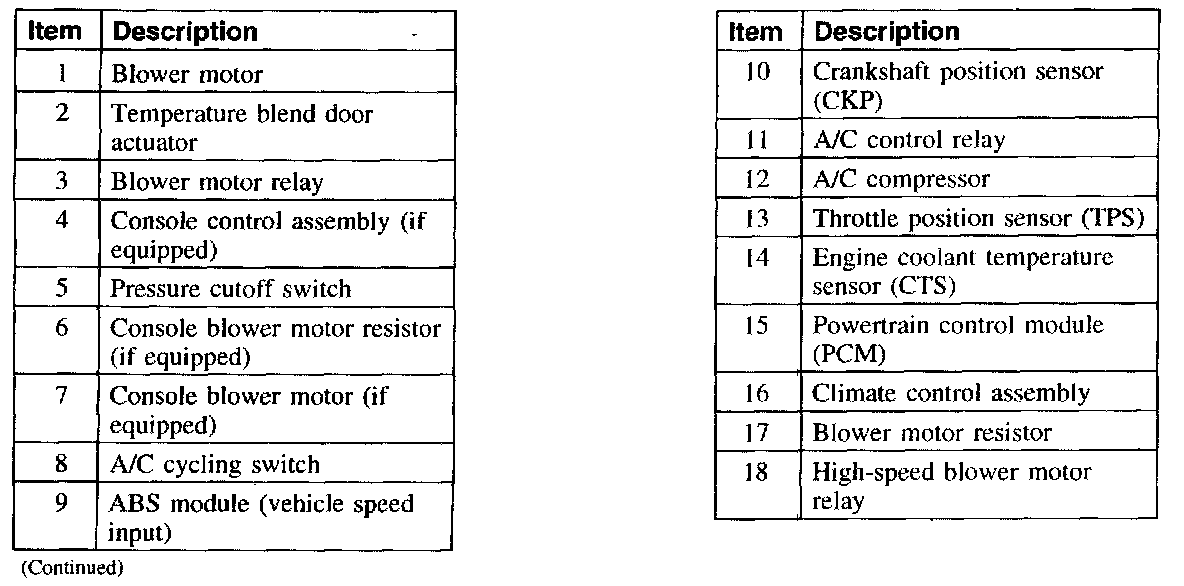 - The panel/floor door vacuum control motor is at full vacuum and the panel/defrost door vacuum control motor is at no vacuum, closing off airflow to the defrost duct, side window demisters, the floor duct, and the instrument panel A/C registers. A small amount of airflow from the side window demisters will be present.