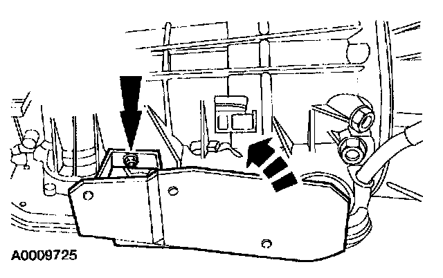 NOTE: If equipped, the transmission servo heat shield needs to be unclipped from the fluid pan rail and positioned out of the way for fluid pan removal.