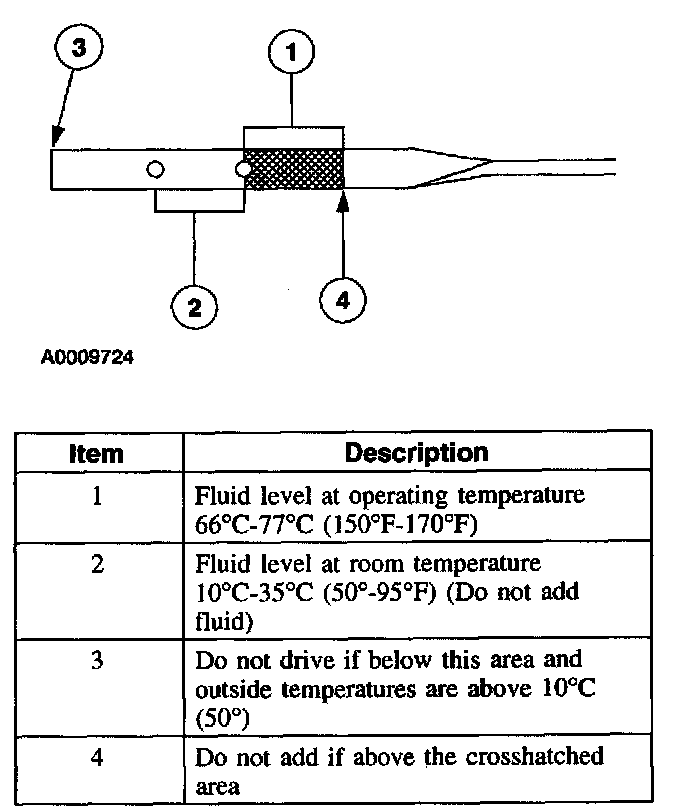 7. Remove the fluid level indicator and inspect the fluid level. The fluid level should be in the designated area for normal and room temperature.