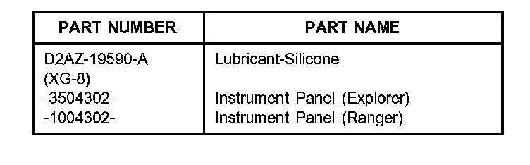 PRIOR TO INSTALLING THE NEW CENTER FINISH PANEL, LIGHTLY GREASE THE BACK SIDE OF THE NEW PANEL WITH ANTI-SQUEAK LUBRICANT, PART NUMBER D2AZ-19590-A (XG-8), TO PREVENT INSTRUMENT PANEL NOISE. AVOID GETTING GREASE ON THE FACE OF THE PANEL.