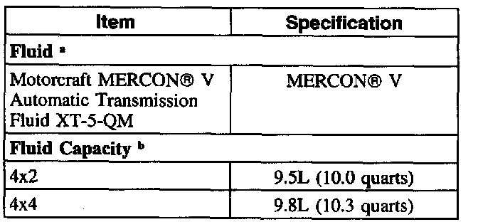 b Approximate dry capacity includes cooler and tubes. Fluid level procedures should be used to determine actual fluid requirements and fluid specification. DO NOT OVERFILL. If it is necessary to add or change fluid, use only fluid, which has been certified by the supplier as meeting the Ford Motor Company specification shown.