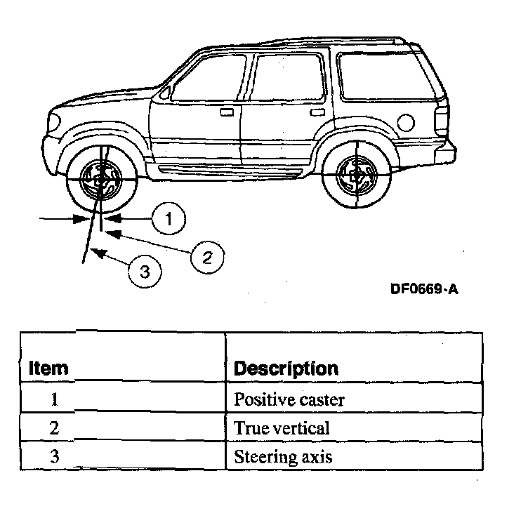 Caster is the deviation from vertical of an imaginary line drawn through the ball joints when viewed from the side. The caster specifications will give the vehicle the best directional stability characteristics when loaded and driven. The caster setting is not related to tire wear.