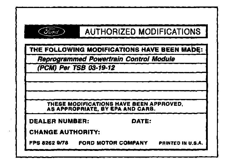 Obtain an Authorized Modifications Decal (FPS 8262 - obtainable through DOES II, 25/pkg) and list the date, dealer number, and summary of modifications performed. Select a prominent place adjacent to the Vehicle Emission Control Information Decal suitable for installing the Authorized Modifications Decal. Clean the area, install the decal, and cover it with a clear plastic decal shield.