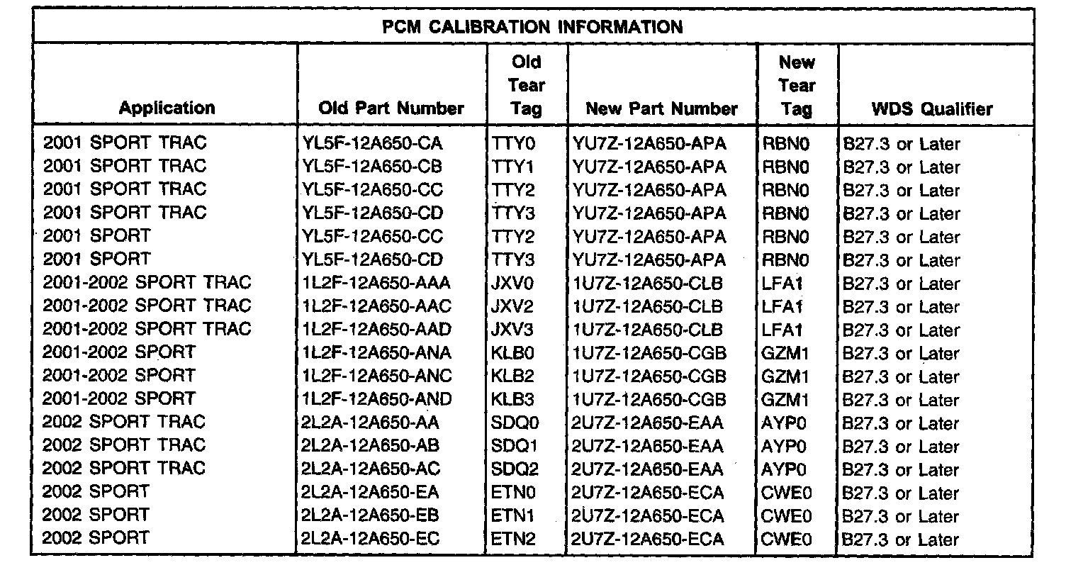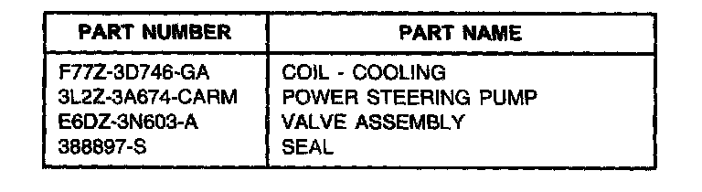 1. All 4X2 Sport Trac vehicles built after 4/18/2001 should omit this step and begin with Step 2 below, as these vehicles are production equipped with a high output displacement pump (Part Number 1L2Z-3A674-GA) and do not require a pump update. All 4X4 and 4X2 Sport vehicles and 4X4 Sport Trac vehicles should replace the Power Steering Pump with a new high displacement pump Part Number 3L2Z-3A674-CARM. BEFORE REPLACEMENT, CLEAN ALL AREAS WHERE DIRT INGESTION COULD OCCUR. FAILURE TO DO SO MAY RESULT IN SYSTEM CONTAMINATION AND NOISE. Refer to the Workshop Manual, Section 211-02 for replacement instructions.