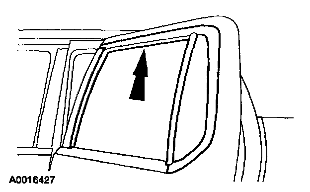CAUTION: Use care not to damage the pin-type retainers retaining the upper forward corner of the door glass top run.
