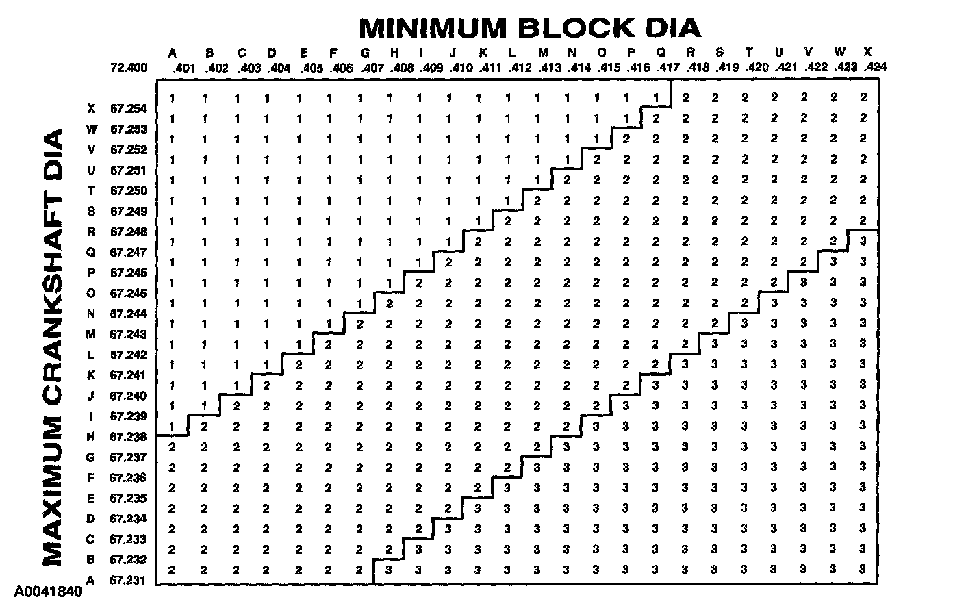 3. Using the data recorded earlier and the Bearing Select Fit Chart, Standard Bearings, determine the required bearing grade for each main bearing.