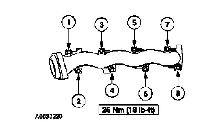 27. Install the LH exhaust manifold and the exhaust manifold gaskets. Tighten the nuts in the sequence shown.