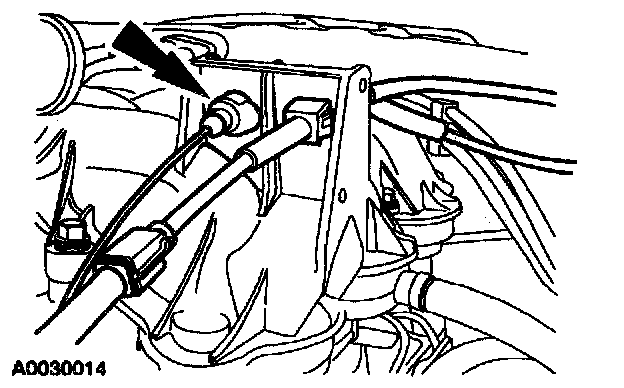1 From inside the vehicle, compress the retaining tabs on the cable and push the cable into the engine compartment until the retaining tabs are disconnected from the dash panel.