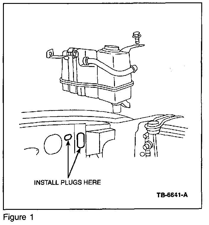 For 2000 and 2001 F150's, install Body Plugs (383181-S and N807093-S) behind the Coolant Overflow Bottle. Refer to Figure 1 for location and plug button installation. These plugs will reduce the engine compartment heat moving into the air cleaner inlet area.