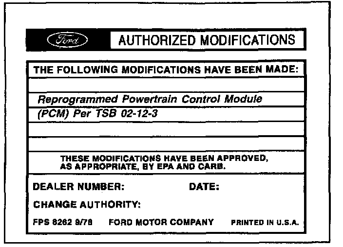 Obtain an Authorized Modifications Decal (FPS 8262 obtainable through DOES II, 25/pkg) and list the date, dealer number, and summary of modifications performed. Select a prominent place adjacent to the Vehicle Emission Control Information Decal suitable for installing the Authorized Modifications Decal. Clean the area, install the decal, and cover it with a clear plastic decal shield.