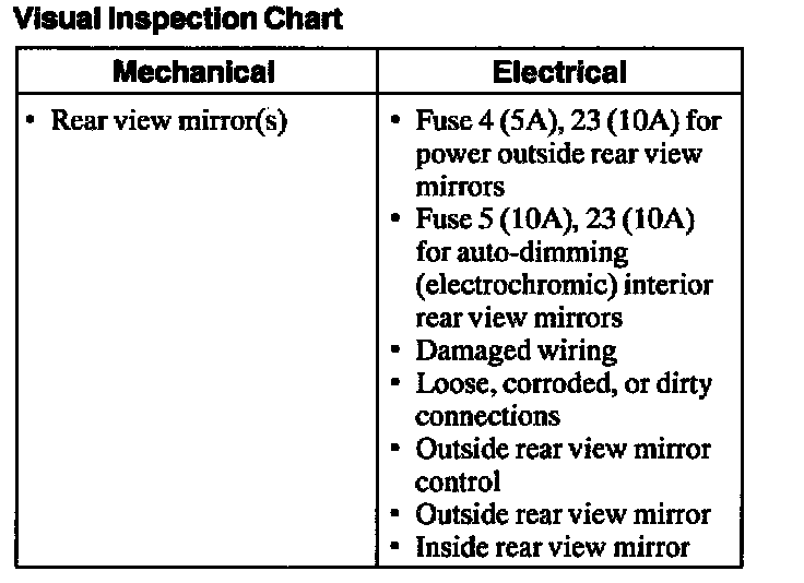 1. Verify the customer concern by operating the power outside rear view mirrors or auto-dimming interior rear view mirror.Visual Inspection Chart: