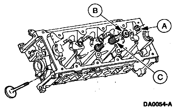 5. Remove the (A) valve spring retainer keys, the (B) valve spring retainers, and the (C) valve spring.
