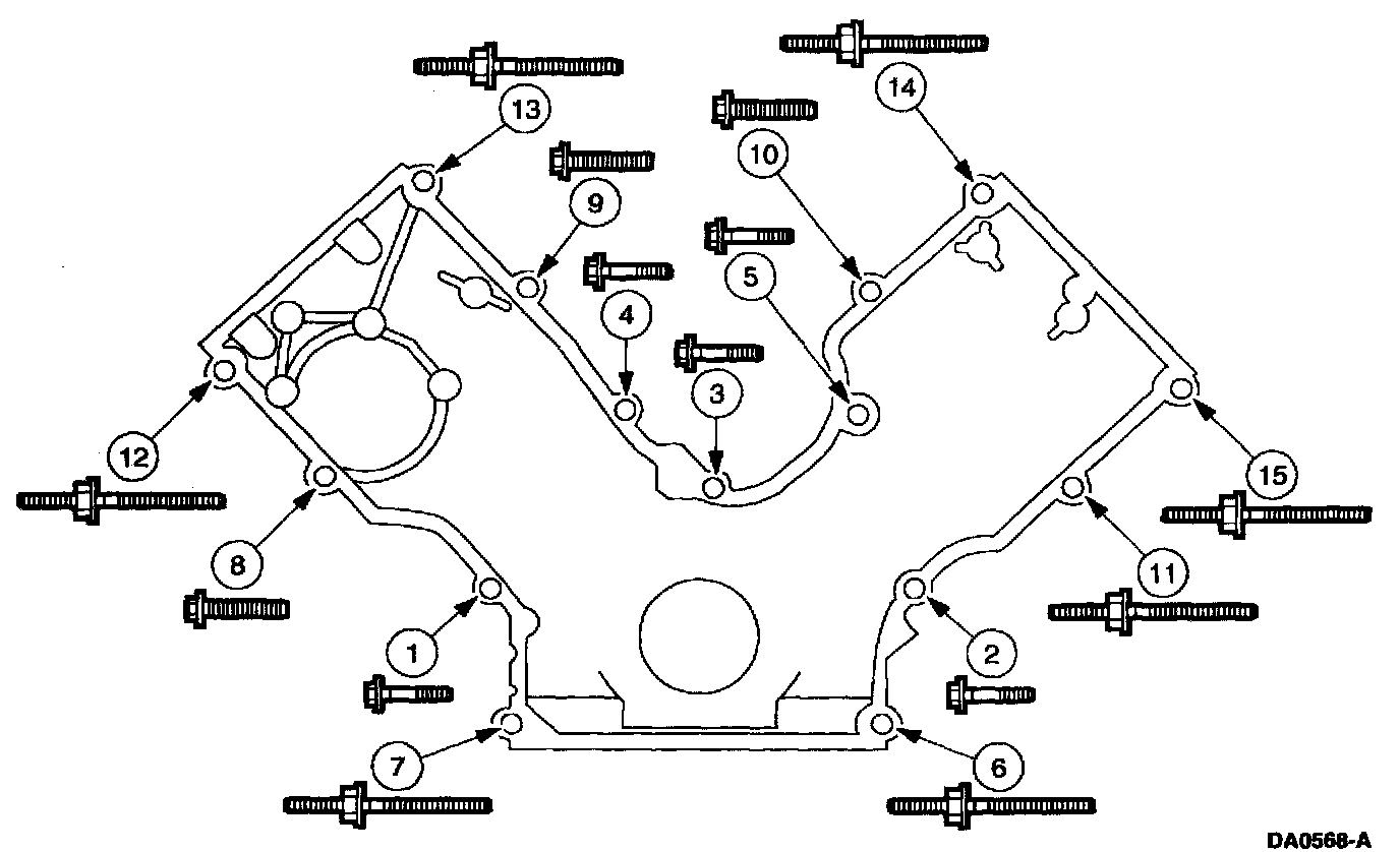 4. Tighten the engine front cover fasteners in sequence in three stages.