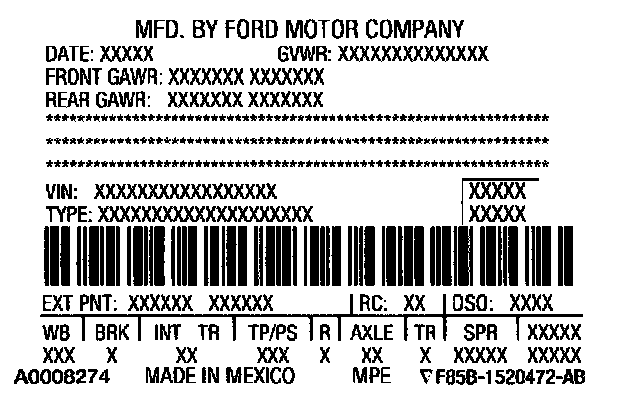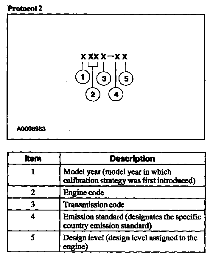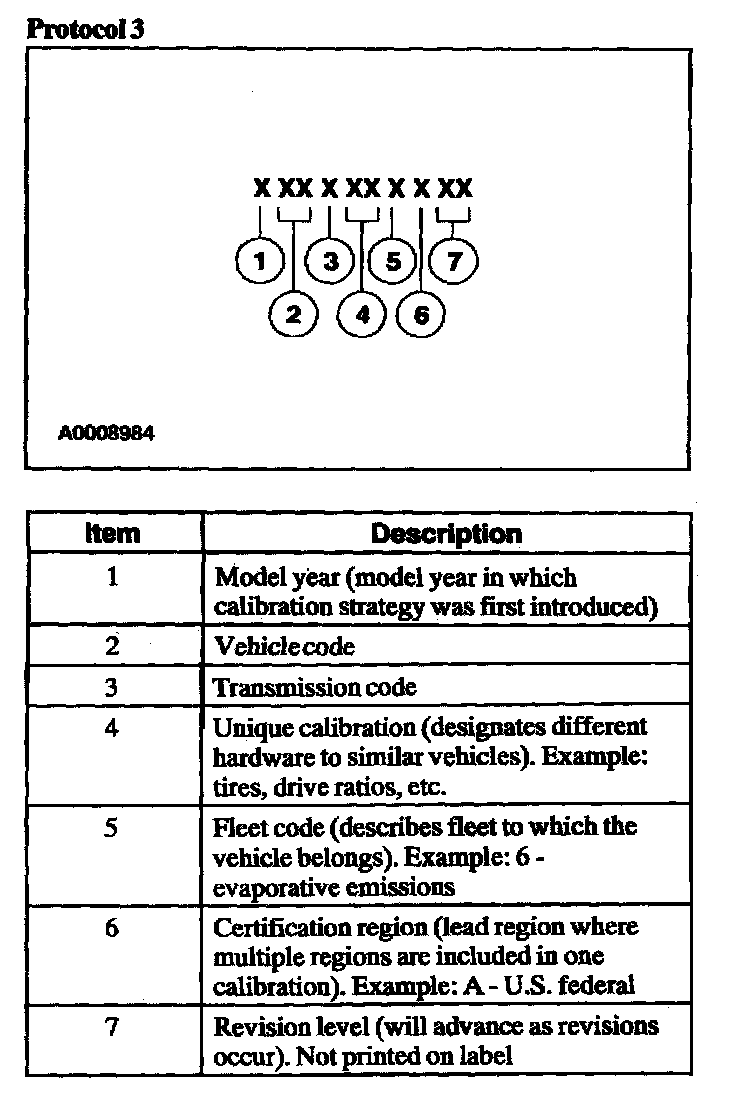 Powertrain calibration information is printed in the lower right corner of the vehicle certification label. Only the base calibration information is printed. Revision levels will not appear, however, they can be found in On Line Automotive Service Information System (OASIS). For the current model year, Ford Motor Company is using three different protocols which describe powertrain base calibration. These protocols are designed to provide worldwide standardization for vehicle calibration. If the electronic calibration strategy was introduced in 1998 and carried into the current model year, Protocol 1 will be used. Refer to Protocol 1. If the electronic calibration strategy was introduced in 1999 and is carried into the current model year, Protocol 2 will be used. Refer to Protocol 2. For new electronic calibration strategies introduced in 2000 or 2001 use Protocol 3. Refer to Protocol 3.