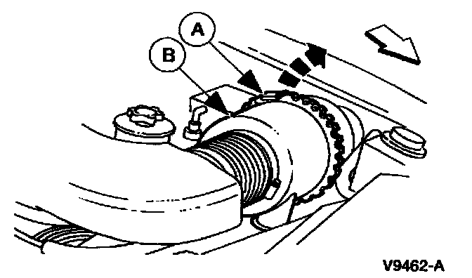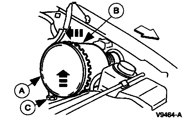 2. Lift the (B) open end of the (A) inlet air cleaner until free of the (C) air cleaner support insulators.