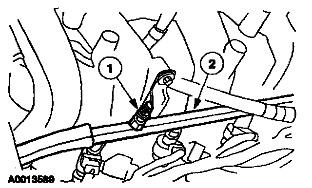 2. Remove the (1) fuel pressure relief valve from the (2) fuel injection supply manifold.