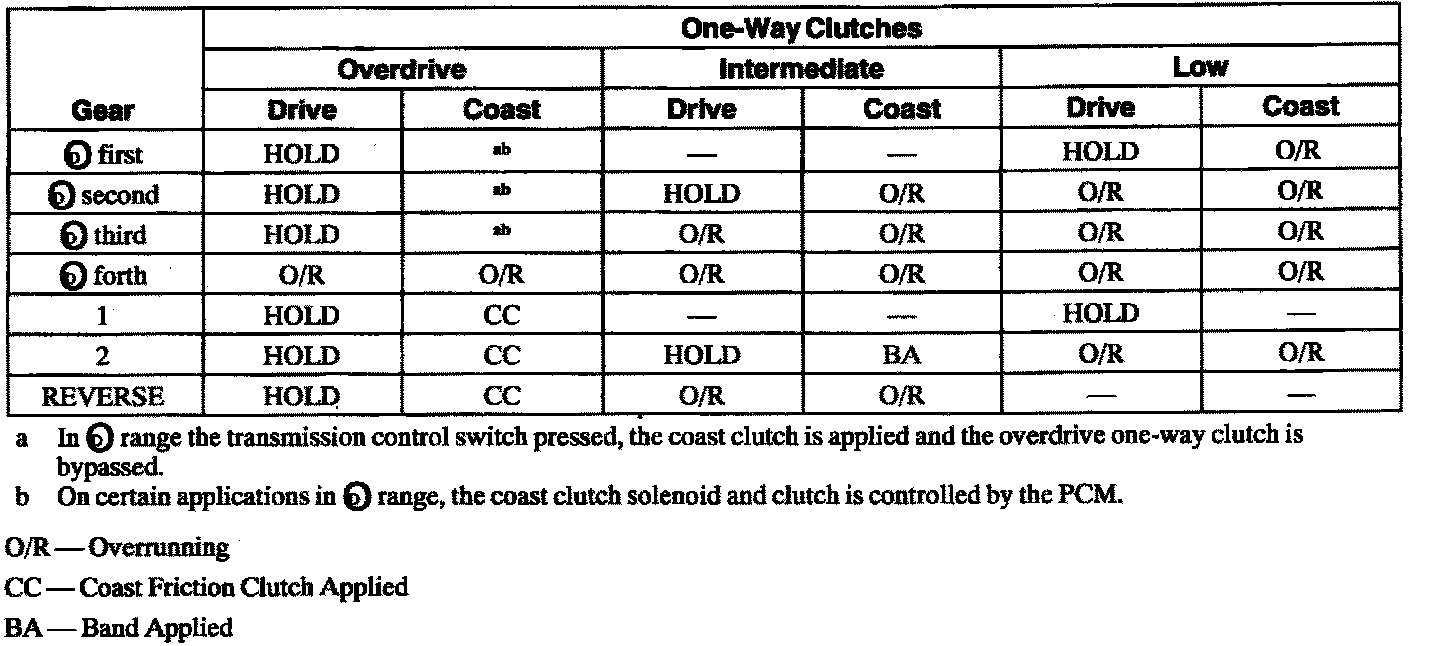 a In range (D) the transmission control switch pressed, the coast clutch is applied and the overdrive one-way clutch is bypassed.