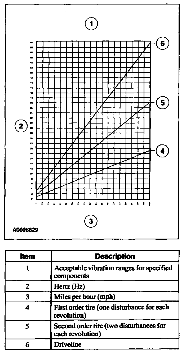 ^ Road test the vehicle at the speed where the vibration is most noticeable. Record the vibration frequency (rpm) and the engine rpm on the worksheet graph. The point on the graph where the vibration frequency (rpm) reading and the engine rpm reading intersect indicates the specific component group causing the concern.