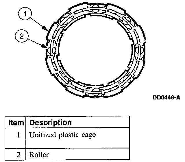 The overdrive one-way clutch, shown in the following illustration, transmits engine torque from the overdrive sun gear to the overdrive ring gear in first, second and third gear range. The overdrive one-way clutch transmits power when the sprags, are engaged between the inner and outer races. The inner race is splined to the coast clutch cylinder, which in turn is splined to the overdrive sun gear. The outer race is splined to the overdrive ring gear.
