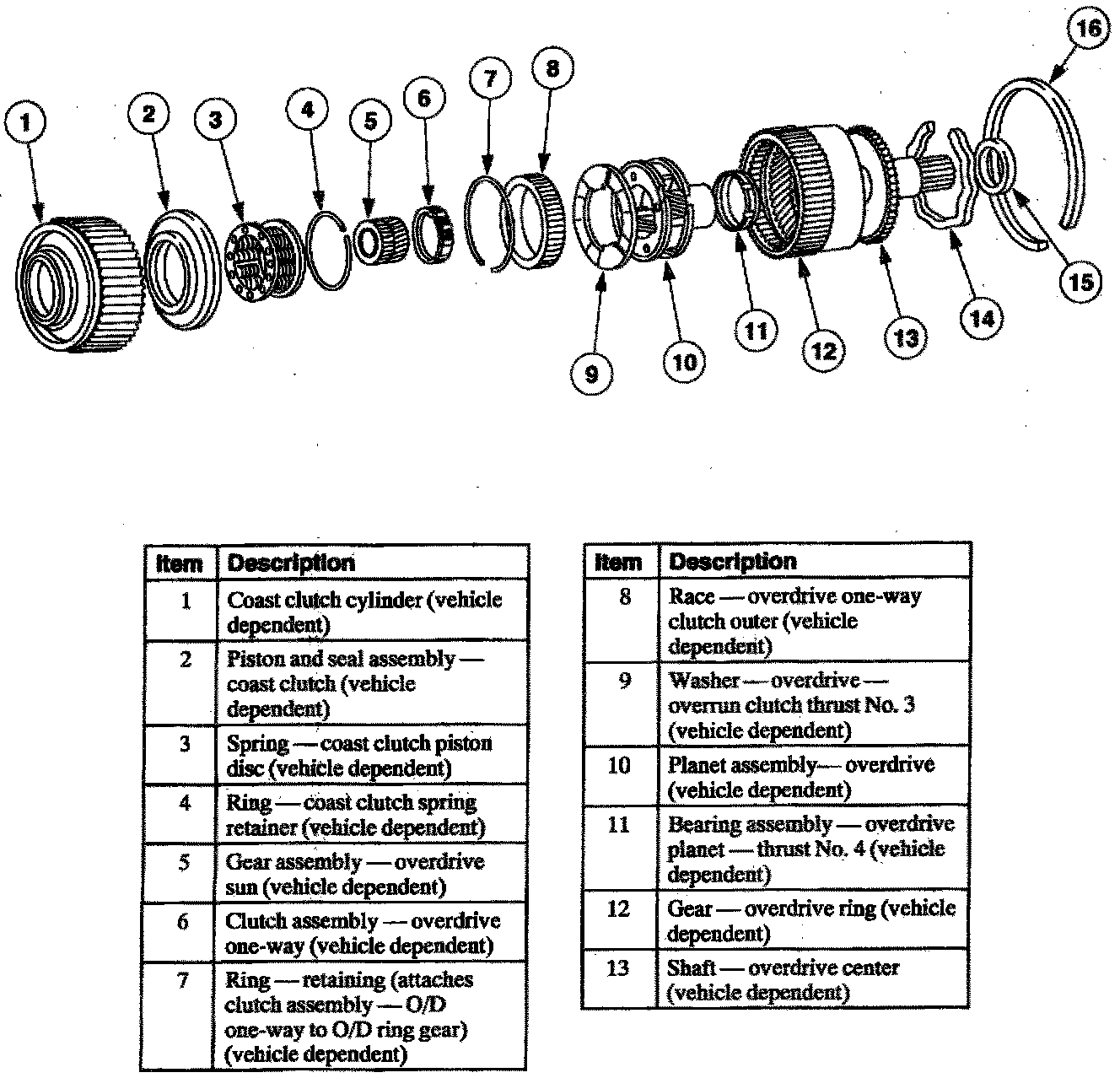 The overdrive clutch is splined between the case and the coast clutch cylinder. The overdrive clutch holds the coast clutch cylinder and, in turn, the overdrive sun gear, to permit the planet assembly to overdrive the ring gear.