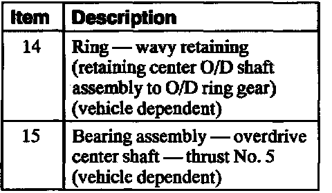The overdrive planetary system consists of the overdrive planet assembly, overdrive sun gear, overdrive ring gear, coast clutch cylinder, overdrive one-way clutch assembly and the center shaft, as shown in the following illustration. The overdrive planet assembly is splined to the input shaft. The overdrive sun gear is centered by a bushing on the input shaft and held in place laterally by needle bearings on the reactor support and the overdrive planet assembly. The overdrive sun gear is splined to the coast clutch cylinder, which in turn is splined to the overdrive one-way clutch inner race.