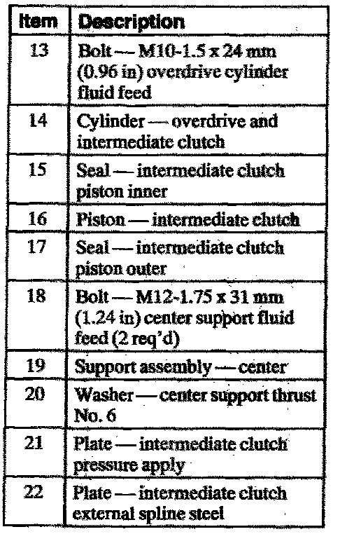 The intermediate/overdrive clutch cylinder is radially supported by the case. Laterally, the cylinder is held in the case by a snap ring. The overdrive circuit is fed through a feed bolt into the cylinder. The intermediate clutch circuit is fed through nearby orifices.
