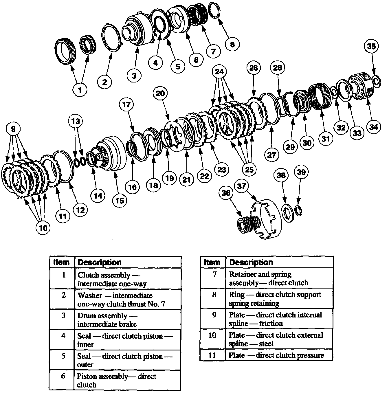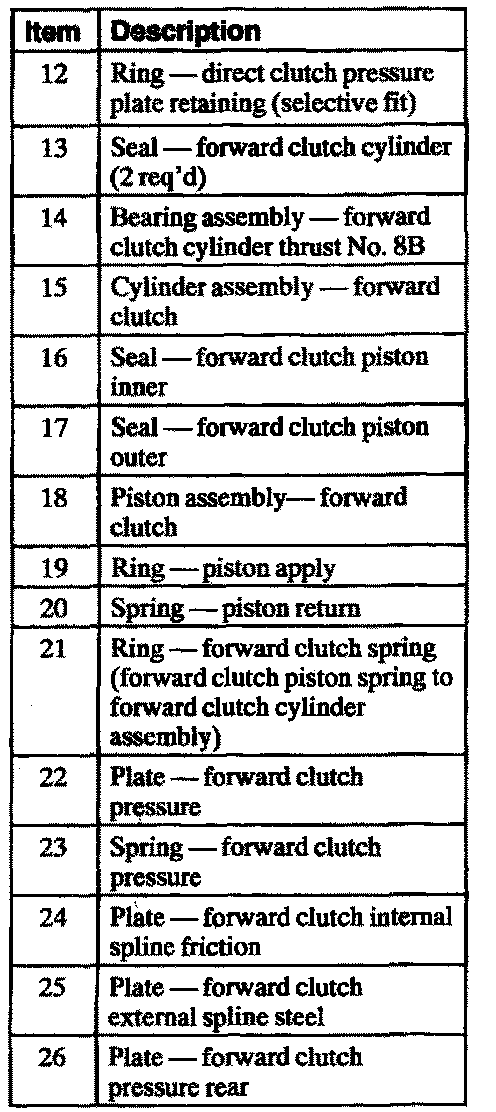 Two friction clutch assemblies, the direct clutch and the forward clutch, are shown with the forward planetary assembly. The direct clutch assembly splines the forward clutch cylinder to the intermediate brake drum. The forward clutch assembly splines the forward clutch cylinder to the forward ring gear. The forward clutch is activated during all forward gears. While in third or fourth gear, both the direct and forward clutches are applied to hold the forward planetary assembly and enable it to act as a solid shaft. in second gear, the intermediate clutch assembly holds the forward/reverse sun gears. It is applied, along with the intermediate one-way clutch, to hold the intermediate brake drum, input shell and forward/reverse sun gear. In higher gears, the one-way clutch overruns.