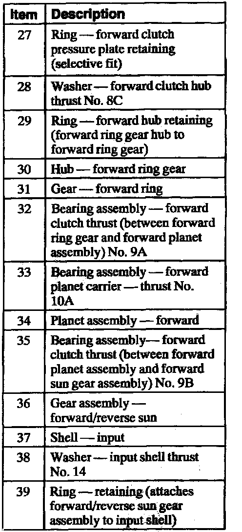 The forward drive system consists of the forward clutch cylinder, intermediate brake drum, intermediate one-way clutch, input shell, forward ring gear, forward ring gear hub, forward/reverse sun gear and the forward planetary carrier and forward planetary gears.