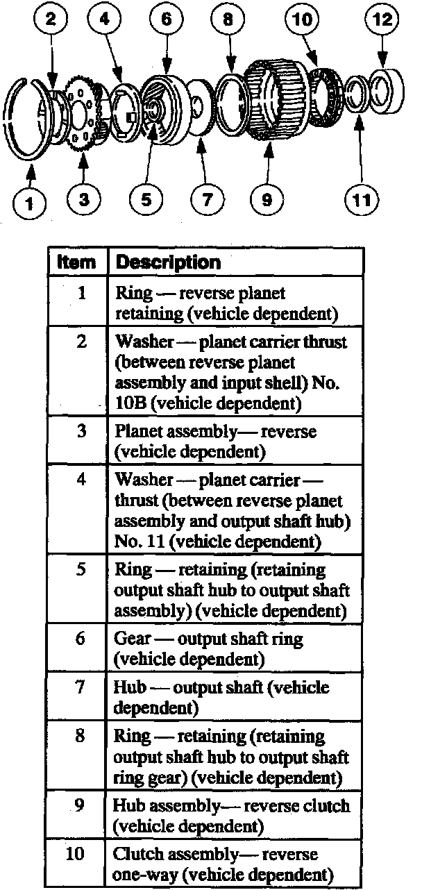 The reverse clutch assembly is activated in REVERSE gear and in MANUAL 1.The reverse clutch bypasses the reverse one-way clutch during coast and MANUAL 1. The reverse clutch holds the reverse planet assembly in REVERSE gear to enable the sun gear to drive the reverse ring gear in the opposite direction.