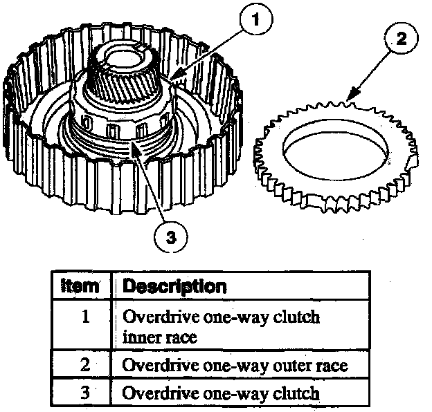 The overdrive one-way clutch engages whenever the overdrive planetary system attempts to drive the overdrive sun gear clockwise when the overdrive ring gear has a counterclockwise torque from the vehicle. When tightened counterclockwise, the overdrive one-way clutch engages and acts as a wedge to lock the sun gear and the ring gear together. During coast, the overdrive one-way clutch enables the ring gear to overrun or spin at a faster rate than the sun gear.