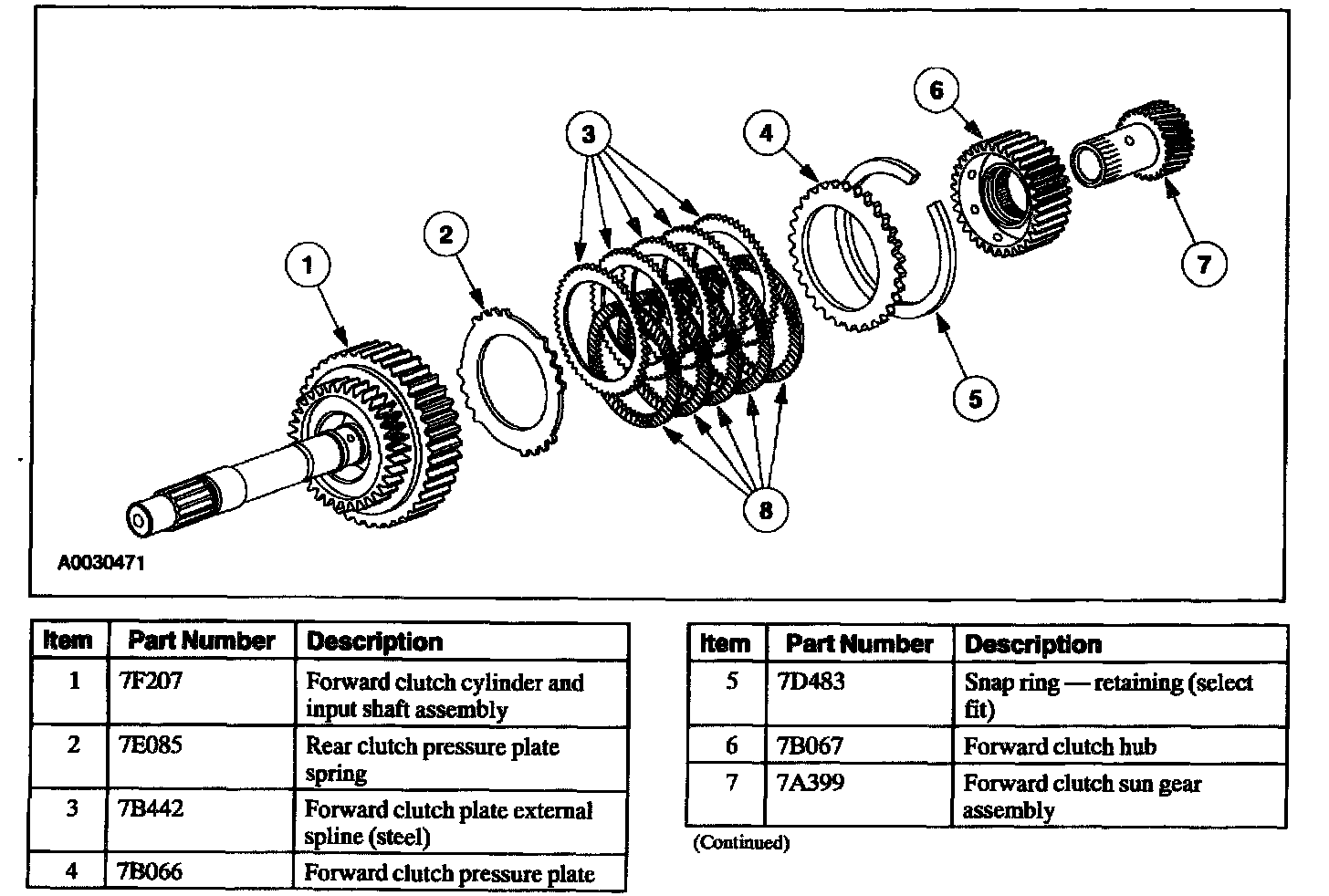 The forward clutch couples the forward clutch cylinder and input shaft to the forward sun gear in first, second, and third gears. The forward clutch is not applied in fourth gear.