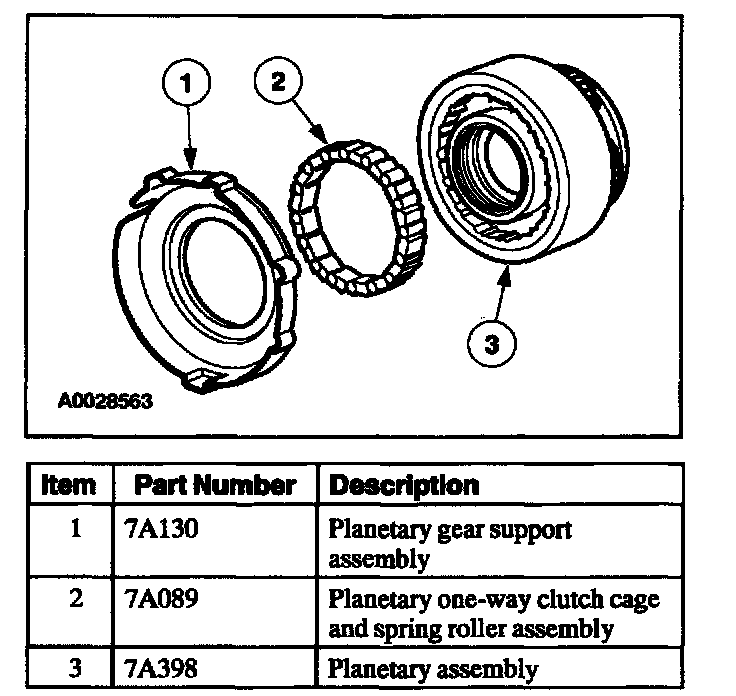 The planetary (low) one-way clutch is a roller clutch that holds the planetary gearset in first gear, (D) and D ranges. During automatic coasting downshifts into first gear (E) and D ranges), the planetary one-way clutch freewheels so there is no engine braking.