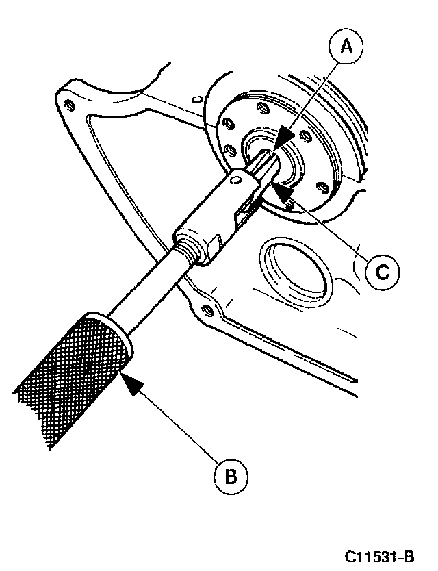Using (B) Impact Slide Hammer and (C) Puller and remove the (A) transmission input shaft pilot bearing.