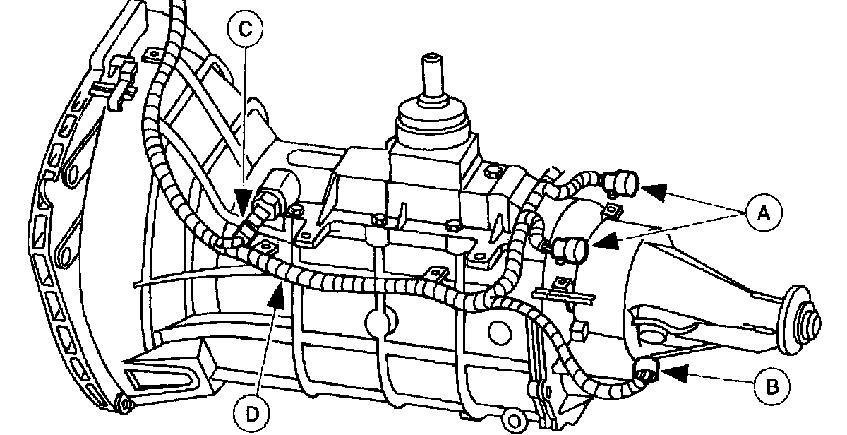 49. Install the (D) wiring harness and connect the (C) backup lamp switch connector, (B) VSS connector, and (A) HEGO sensor connectors.