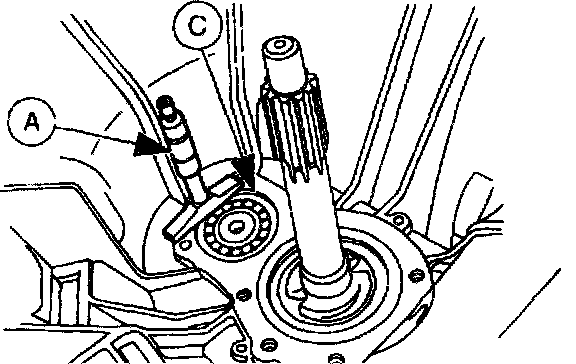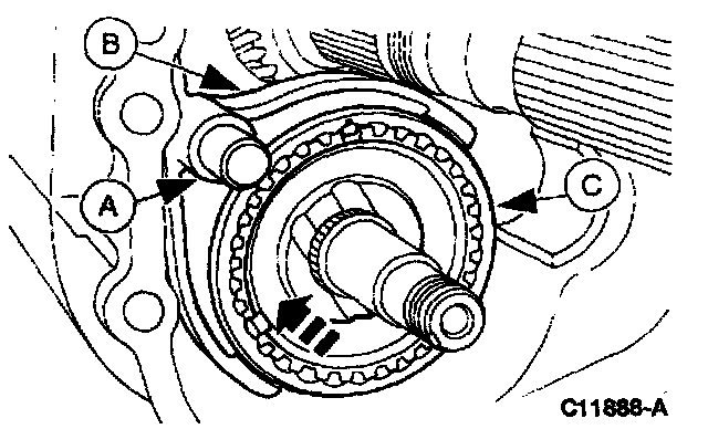 Install the (A) fifth/reverse shift rail, (B) shift fork and (C) synchronizer.