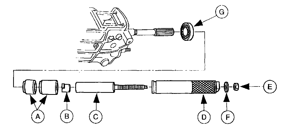36. Use (A) Gear Installing Spacer (4x2 models only), Gear Installing Spacer, (B) Shaft Collar (4x2) or Shaft Collar (4x4), (C) Shaft Sleeve Replacer, (D) Remover/Replacer Tube, (E) nut and (F) washer to install the (G) output shaft rear bearing.