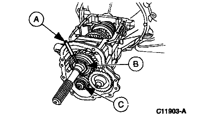 Position the (A) bearing shim, (B) fluid baffle and (C) countershaft spacer onto the front bearing retainer.