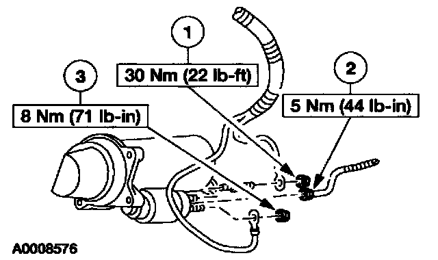 1 Remove the starter motor ground cable nut and disconnect the starter motor ground cable.