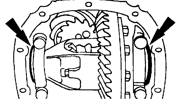 51. To decrease the backlash, install a thicker differential bearing shim and a thinner differential bearing shim as shown.