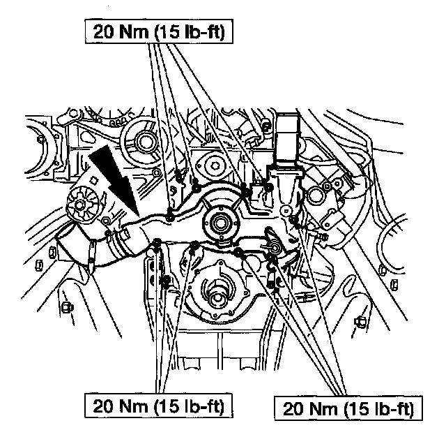 24. Install the water pump and the bolts as noted during removal. Tighten the water pump and engine front cover bolts.